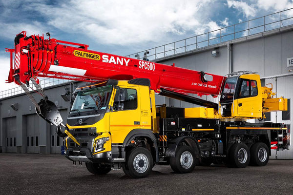 Автомобільний кран Palfinger Sany SPC 400, що має 5 секцій, в/п 40 т. Вантажний момент 140 тм, довжина стріли 10,5–40,5 м, гусьок 9 м, максимальний підйом і виліт 36 м та 34 м відповідно.