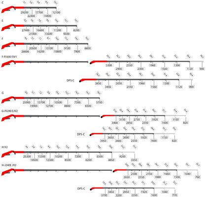 Вказані вильоти стосуються кута нахилу стріли 20° і тому не є максимальними. При використанні механічних подовжувачів стріли навантаження, зазначені на діаграмах, необхідно зменшити на вагу цих подовжувачів.