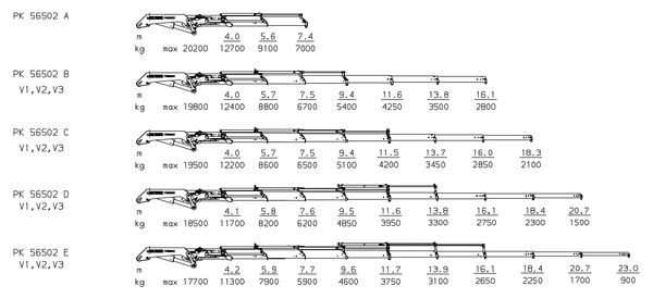 PK 56502 E V1, V2, V3 | 42,7 тм | 23,0 м | 17700 кг | 900 кг | 370 º | 6119 кг | Дізнатись ціну |