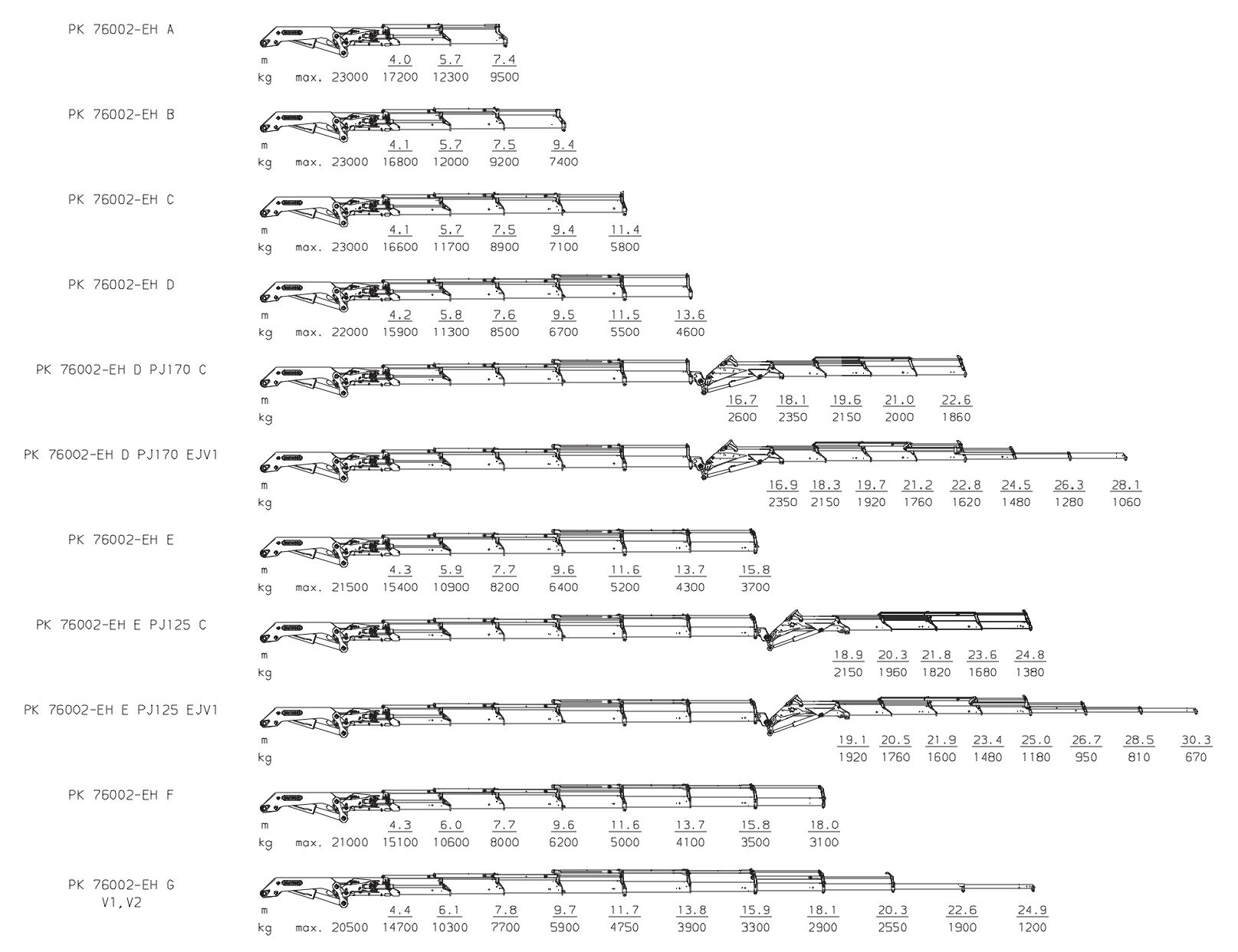 Характеристики модифікацій на кран-маніпулятор Palfinger PK 76002 EH High Performance