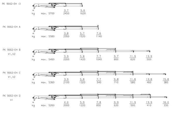 PK 9002-EH B V1, V2 | 8,5 тм | 13,9 м | 5460 кг | 500 кг | 400 º | 1271 кг | Дізнатись ціну |