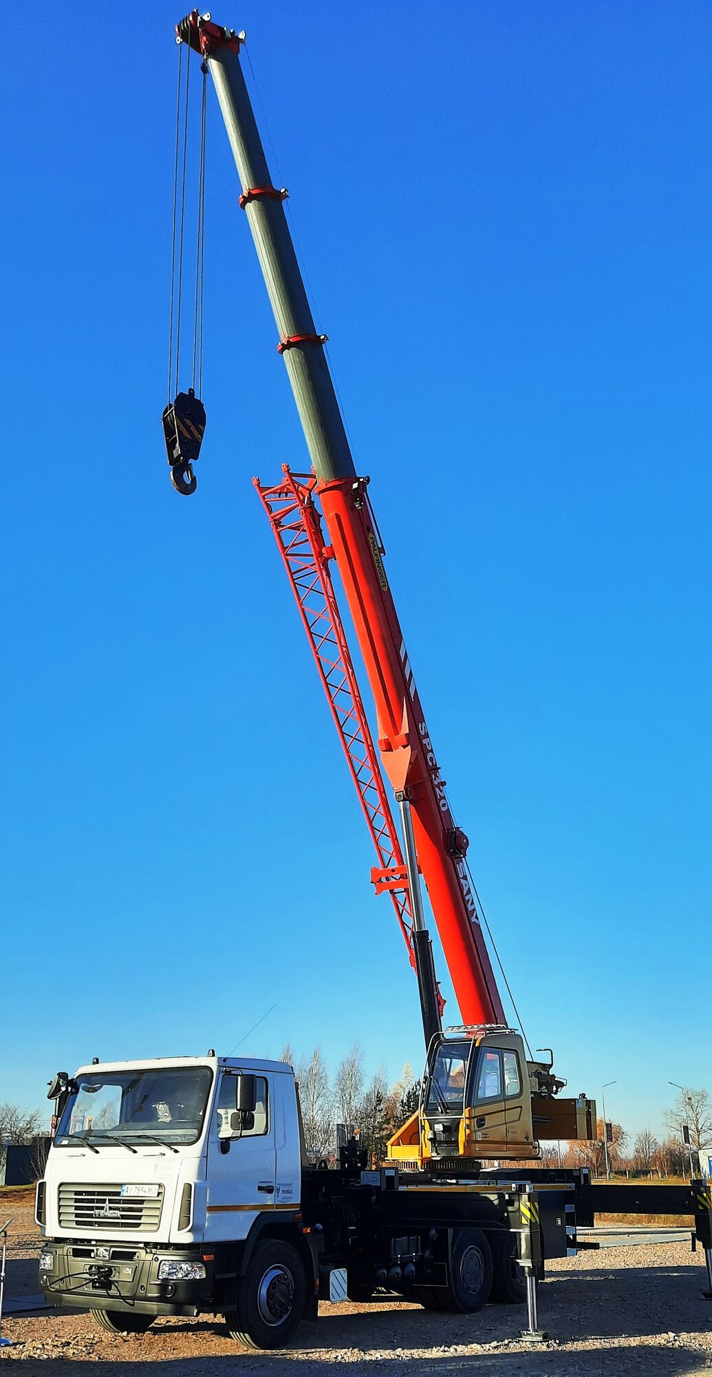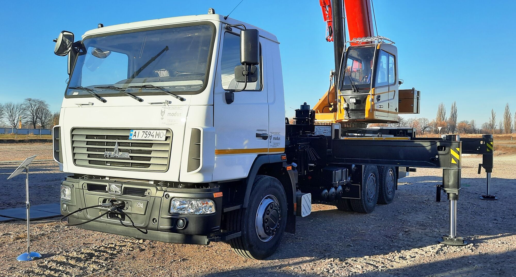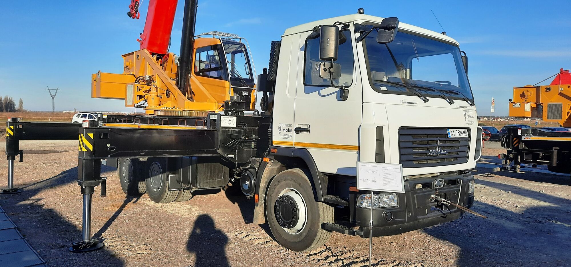 Еще на стенде МЧП «Модус» гости выставки «Автодорэкспо-2021» могли увидеть наиболее востребованную модель автокрана Palfinger Sany в Украине — с грузоподъемностью 32 тонны. Крановая установка установлена на грузовом шасси МАЗ-6302.