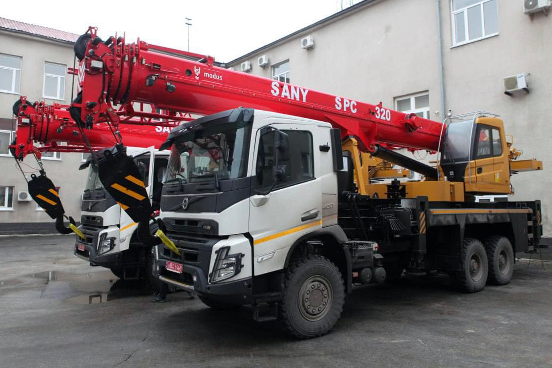 В начале февраля 2024 года АО «Харьковоблэнерго» уже получили три 18-тонных автокрана от нашего завода. Теперь настал черед отправить харьковским энергетикам в эксплуатацию еще два более мощных по грузоподъемности автомобильных крана — SANY SPC 320 на базе грузовых шасси VOLVO.