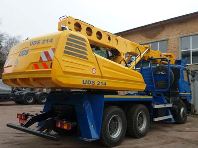 Экскаватор-планировщик UDS-214 от словацкой компании-производителя CSM — это модель самоходной строительной машины с телескопической стрелой с экскаваторным ковшом, машина оснащена функцией микрошага. Надстройку UDS-214 установили на базовое шасси МАЗ — эту работу выполнили на производстве МЧП «Модус» в Прилуках (Черниговская область).