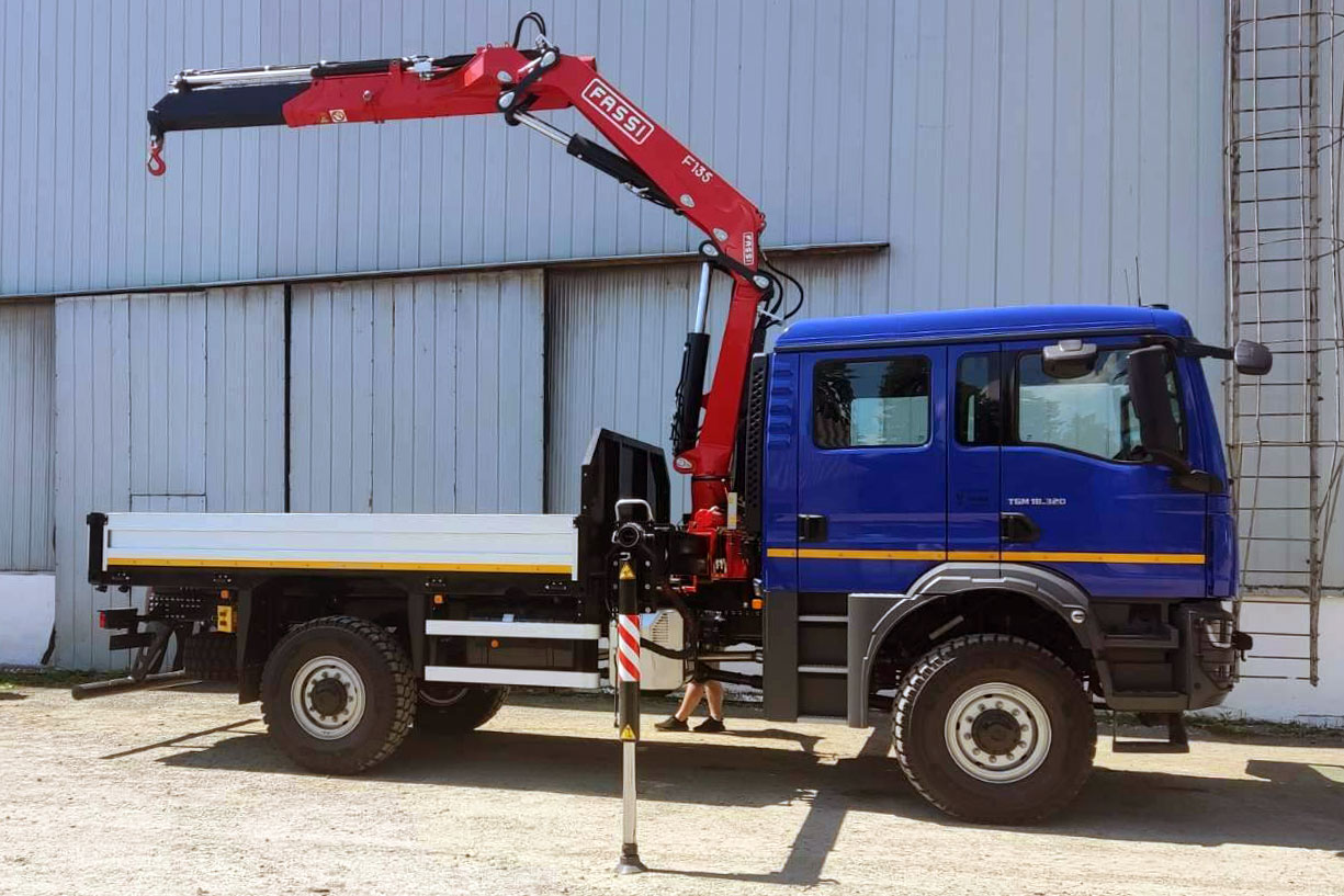 - бортовая платформа на базе грузового шасси MAN, за кабиной которого установлен итальянский кран-манипулятор FASSI.
