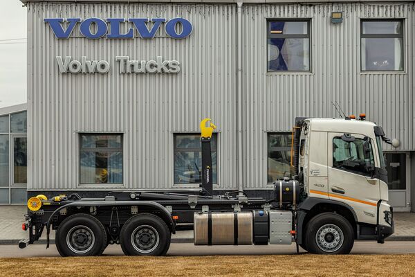 - На автомобиле VOLVO с колесной формулой 6 установлены хук-лифты Ampliroll AL22 S грузоподъемностью 22 тонны.