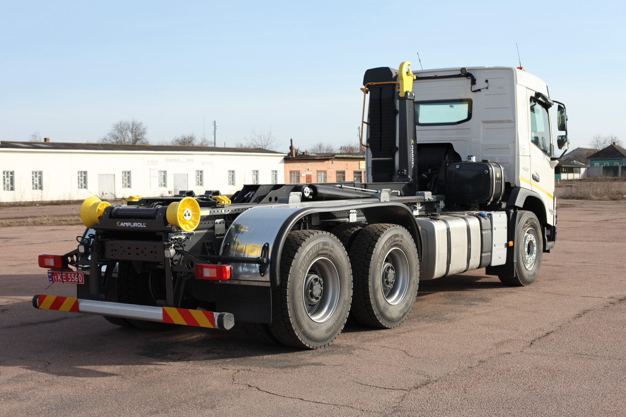 - На автомобиле VOLVO с колесной формулой 6 установлены хук-лифты Ampliroll AL22 S грузоподъемностью 22 тонны.