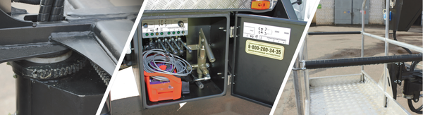 Для перевозки гидрооборудования с внутренними компонентами*. Находится с правого бока шасси (* аварийный насос, панель управления аутригерами, нижний пульт управления) |