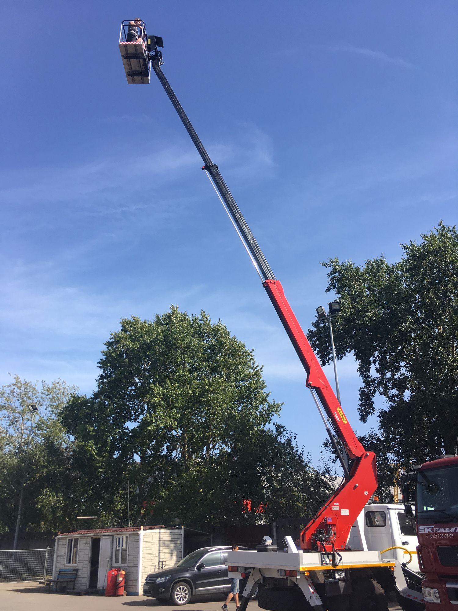 - Поворотный круг. Опора поворотного круга, стреловая система, алюминиевая корзина на два человека, платформа с 4 гидравлическими аутригерами