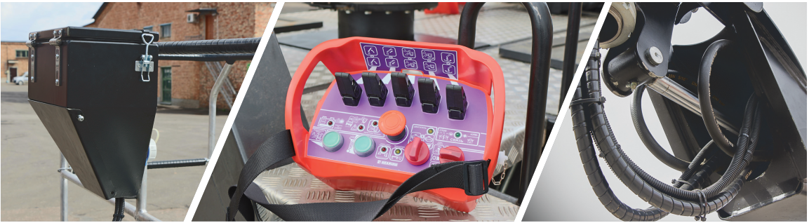 - 2 пульта управления — в корзине и на платформе. Нижний пульт оснащен кабелем 10 м