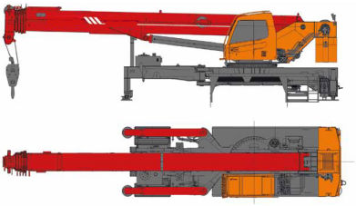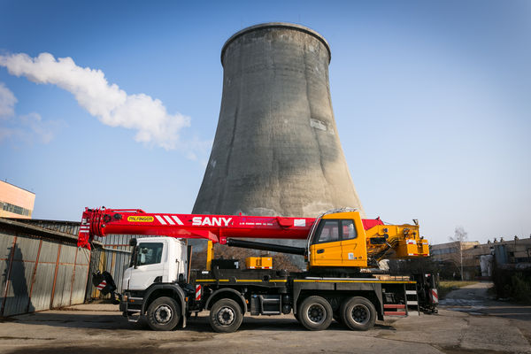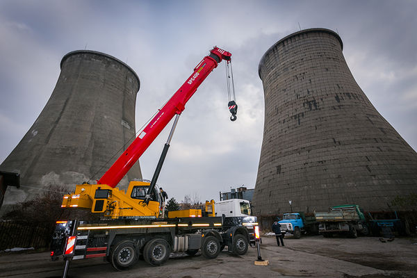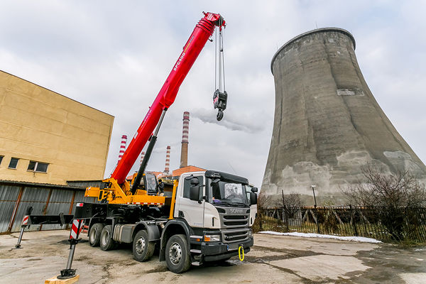 Короткобазный кран Palfinger Sany SPC 400, имеет 5 секций, г/п 40 т. Грузовой момент 140 тм, длина стрелы 10,5–40,5 м, гусек 9 м, максимальный подъем и вылет 36 м и 34 м соответственно.
