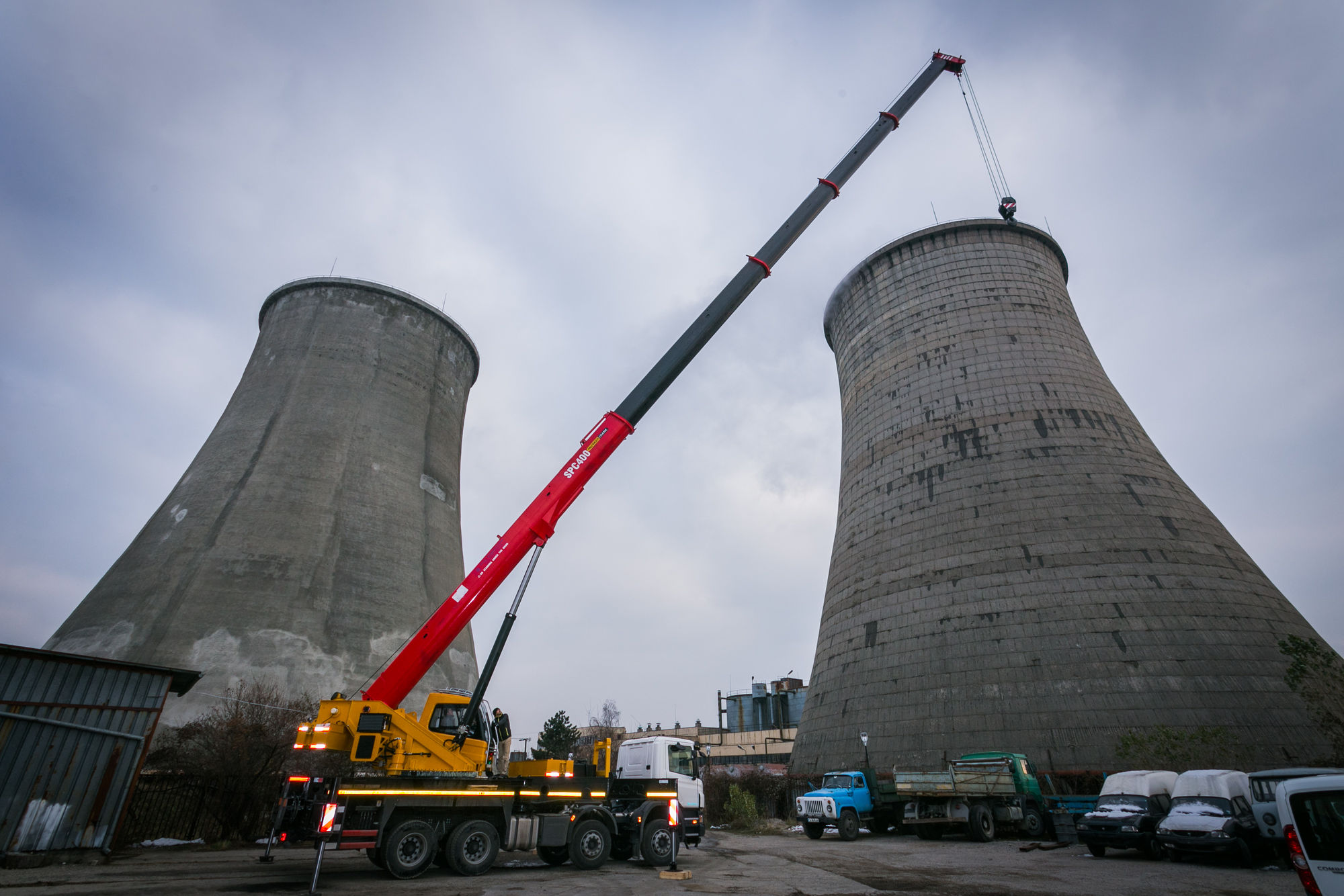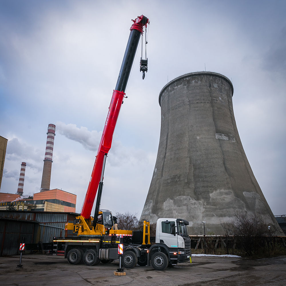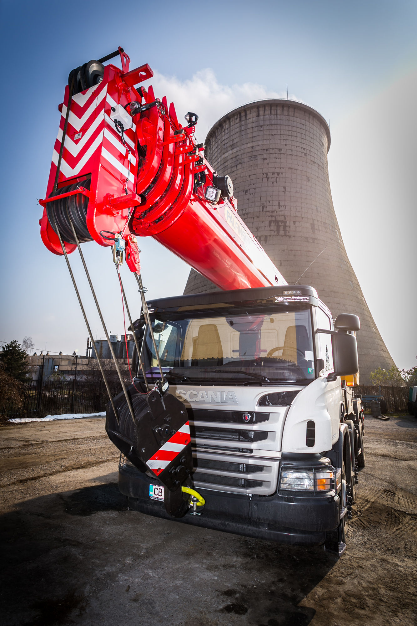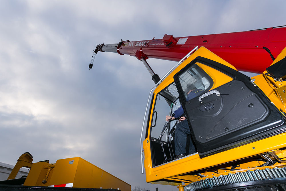 Короткобазный кран Palfinger Sany SPC 400, имеет 5 секций, г/п 40 т. Грузовой момент 140 тм, длина стрелы 10,5–40,5 м, гусек 9 м, максимальный подъем и вылет 36 м и 34 м соответственно.