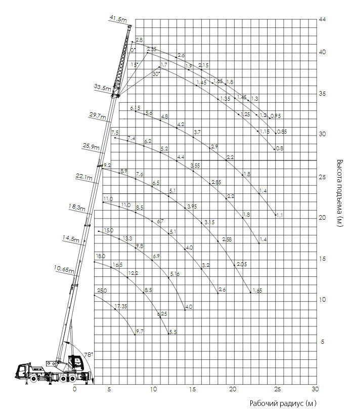 Автомобильный кран Palfinger Sany STC 250 имеет 4 секции стрелы, г/п 25 т. . Грузовой момент 98,2 тм, стрела 10,65–33,5 м, гусек 8 м, максимальный подъем и вылет 43,5 м и 26 м соответственно. Крановая установка смонтирована на спецшасси.