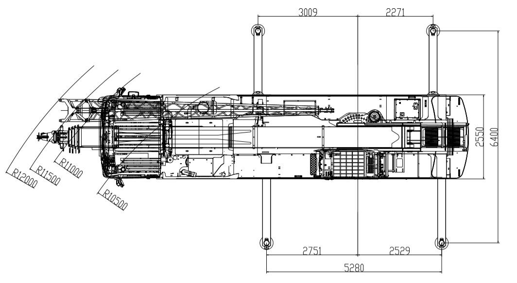 - Размеры опорного контура аутриггеров 6,4×5,28 м
