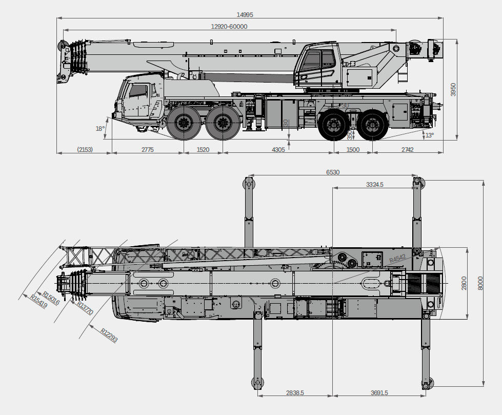 Прочное базовое спецшасси G-класса шириной 2,8 м, выносные опоры типа H и крепкая рама с прямоугольным поперечным сечением, что улучшает устойчивость к скручиванию и изгибу и обеспечивает удобство работы. Сверхпрочные мосты HANDE, макс. подъемность 45%, расход топлива 45 л/100 км, возможность медленно передвигаться с противовесом 19,2 т на короткие расстояния. Передняя ось оснащена высокоэффективным барабанным тормозом. Дорожный просвет 302 мм, подход/вылет угол 18°/13°, лучшая гибкость передвижения. Оборудовано топливным баком большого объема 450 л.