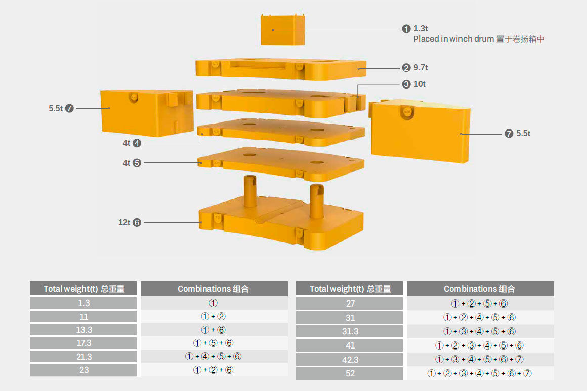 Собственная технология перемещения противовеса от Sany, цилиндр подъема противовеса можно перемещать вперед и назад на 550 мм. 12 комбинаций противовеса: 1,3 т, 11 т, 13,3 т, 17,3 т, 21,3 т, 23 т, 27 т, 31 т, 31,3 т, 41 т, 42,3 т, 52 т. Можно достигнуть 24 комбинаций эффектов с технологией SANY Adjustable Counterweight Technology (SACT).