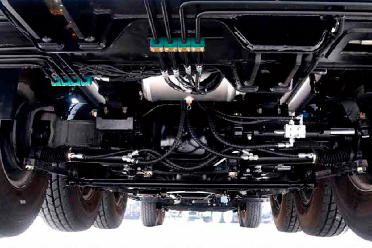 Прочное базовое спецшасси G-класса шириной 3 м, выносные опоры типа H и мощная рама с прямоугольным поперечным сечением, что улучшает устойчивость к скручиванию и изгибу и обеспечивает удобство работы. Сверхпрочные мосты HANDE, макс. подъемность 45 %, расход топлива 50 л/100 км, возможность медленно передвигаться с противовесом 23 т + 4 выносными опорами на борту на короткие расстояния. Все оси оснащены высокоэффективными барабанными тормозами. Дорожный просвет 310 мм, подход/вылет угол 17 °/17 °, лучшая гибкость передвижения. Оборудовано топливным баком большого объема 450 л.