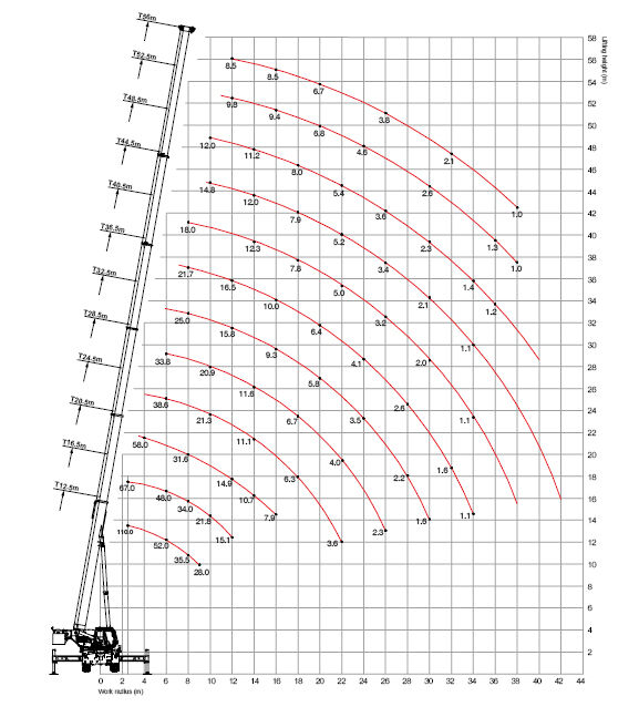 Модель | Грузовой момент | Мин. вылет стрелы | Макс. вылет стрелы | Грузоподъемность на мин. вылете стрелы | Грузоподъемность на макс. вылете стрелы | Максимальная высота подъема | Количество секций | Стоимость |