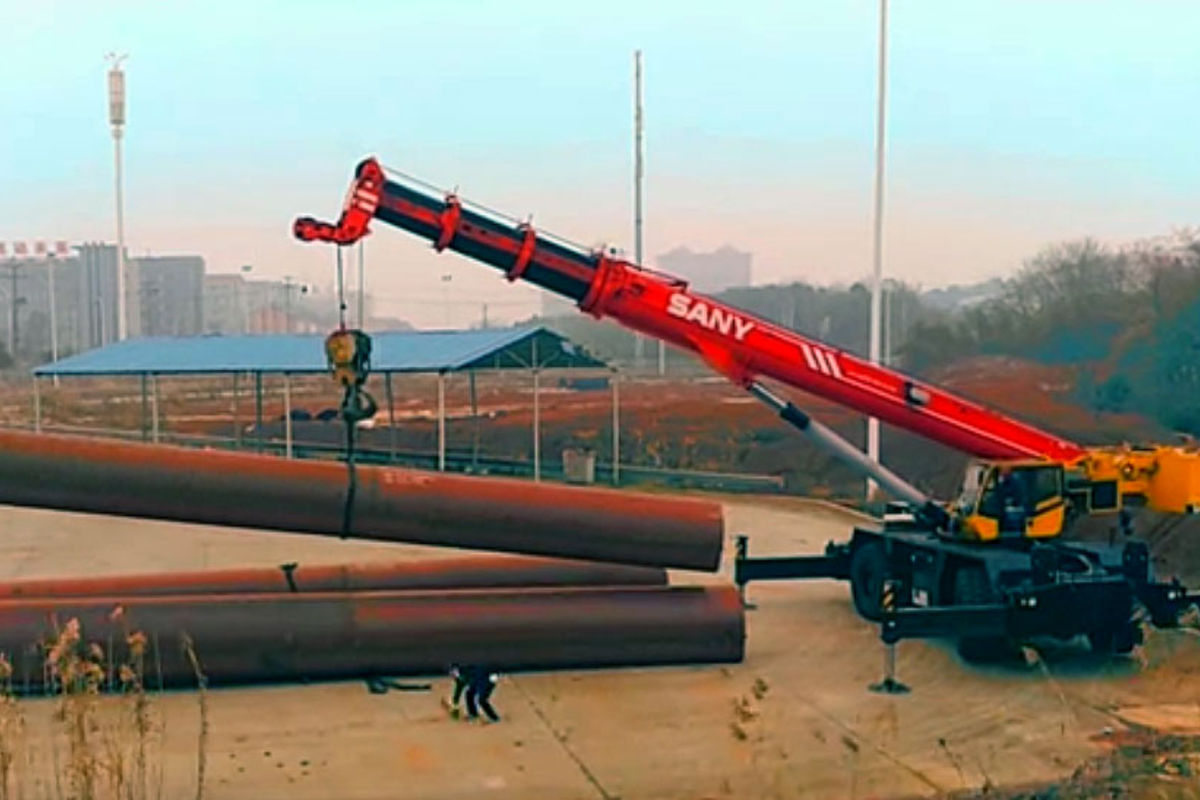 Короткобазный кран Palfinger Sany SRC 1200C, имеет 5 секций, г/п 120 т. Грузовой момент 365,8 тм, длина стрелы 13–49 м, гусек 10,7–18 м. Самоходное шасси 4×4.