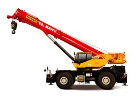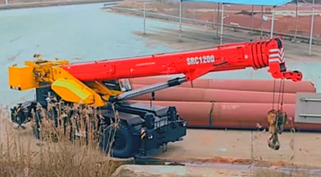 Короткобазный кран Palfinger Sany SRC 1200C, имеет 5 секций, г/п 120 т. Грузовой момент 365,8 тм, длина стрелы 13–49 м, гусек 10,7–18 м. Самоходное шасси 4×4.