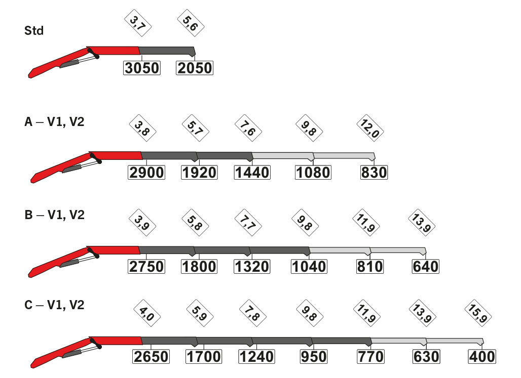 Вылеты указаны при угле наклона стрелы 20° и, следовательно, не являются максимальными. При использовании механических удлинителей стрелы значения нагрузки, указанные в таблицах, необходимо уменьшить на вес этих удлинителей.