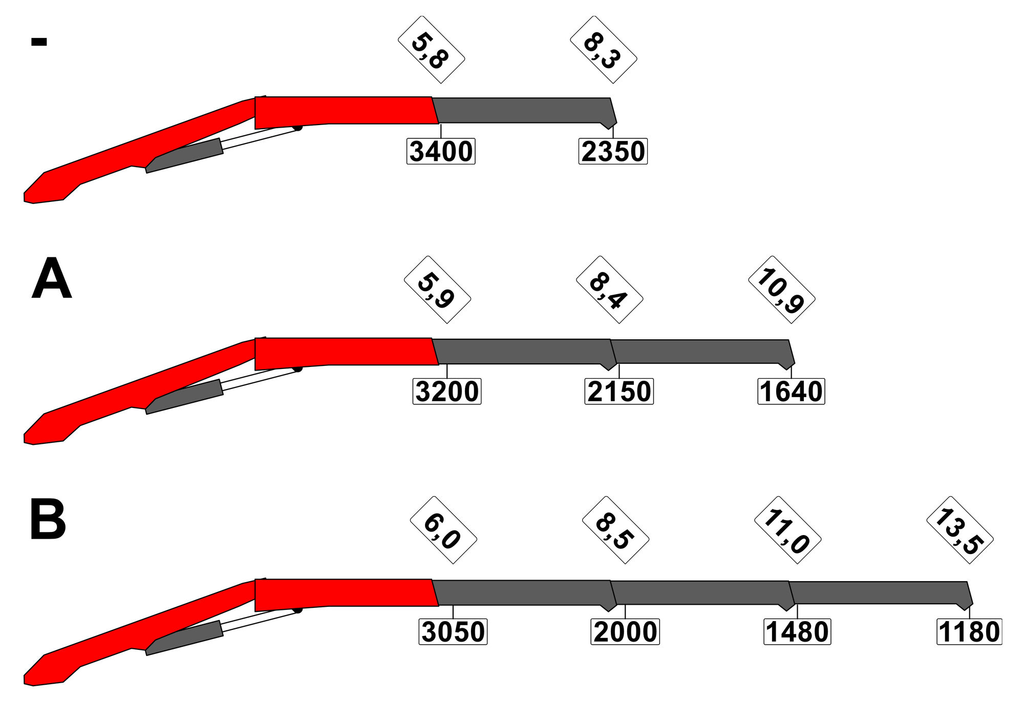 Указанные вылеты указаны для угла наклона стрелы 20 ° и, следовательно, не являются максимальными. При использовании механических удлинителей стрелы нагрузки, указанные в таблицах, необходимо уменьшить на вес этих удлинителей.