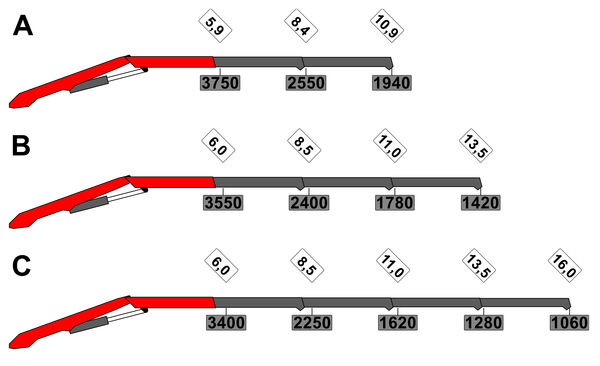 Указанные вылеты указаны для угла наклона стрелы 20 ° и, следовательно, не являются максимальными. При использовании механических удлинителей стрелы указанные в таблицах нагрузки необходимо уменьшить на вес этих удлинителей.