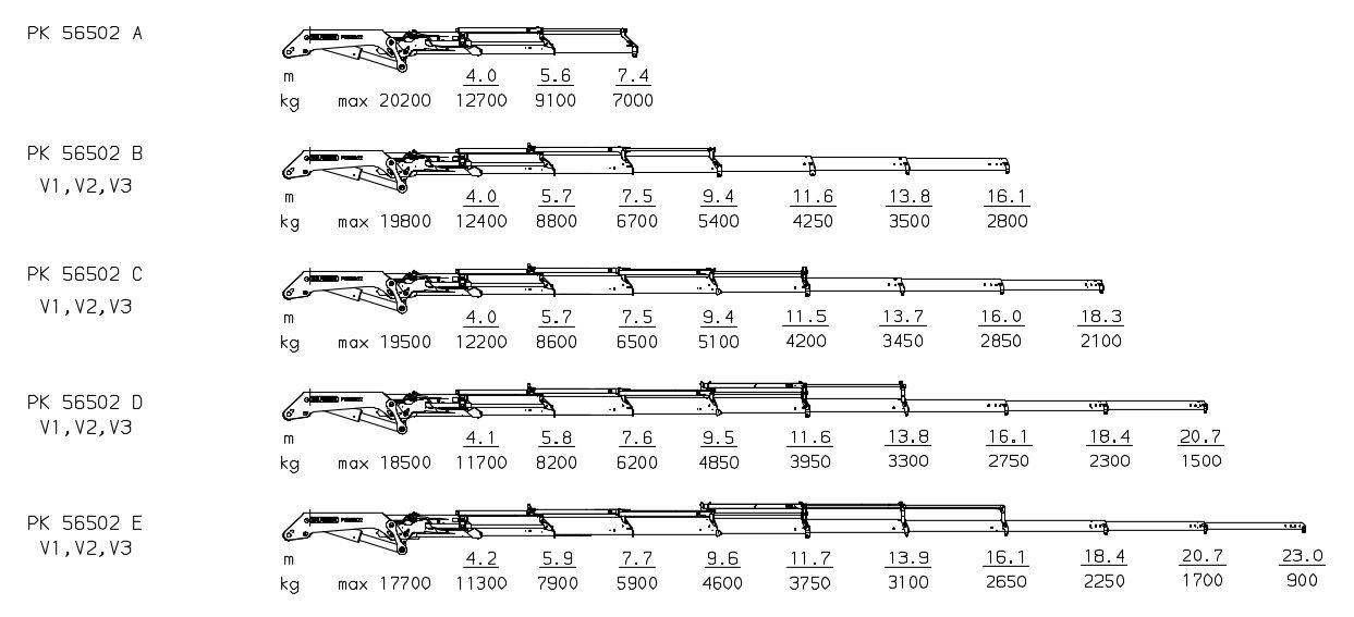 PK 56502 D V1, V2, V3 | 45,5 тм | 20,7 м | 18500 кг | 1500 кг | 370 º | 5910 кг | Узнать цену |