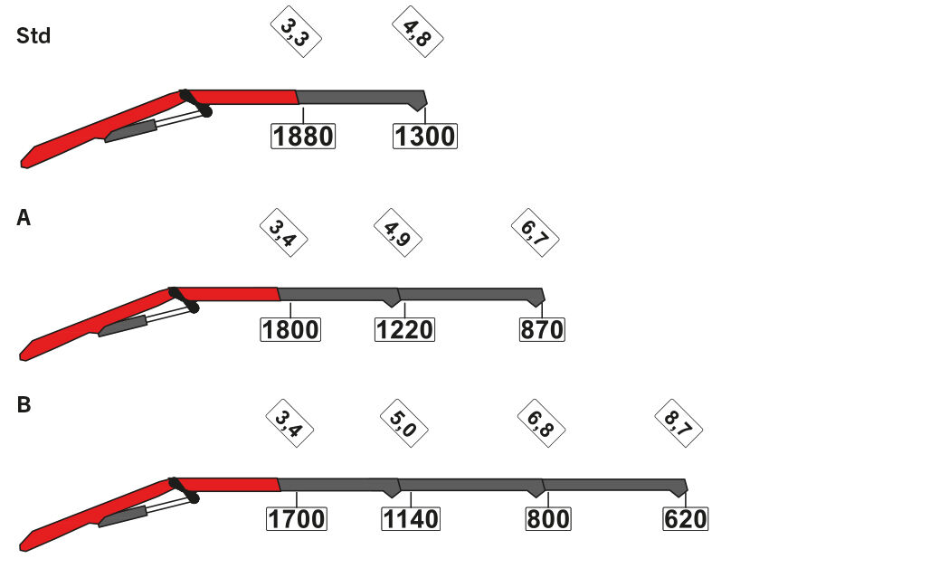 Указанные вылеты касаются угла наклона стрелы 20 ° и поэтому не максимальны. При использовании механических удлинителей стрелы нагрузки, указанные на диаграммах, необходимо снизить на вес этих удлинителей.