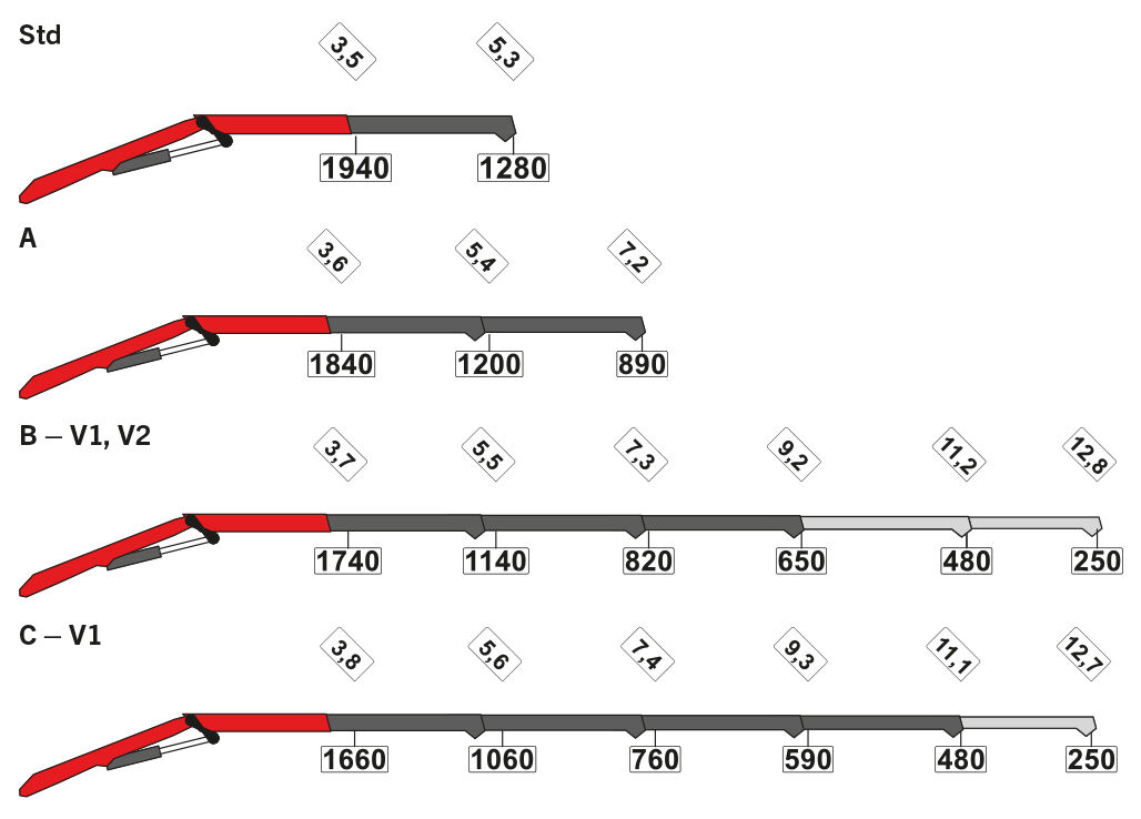 Указанные вылеты касаются угла наклона стрелы 20° и поэтому не максимальны. При использовании механических удлинителей стрелы нагрузки, указанные на диаграммах, необходимо снизить на вес этих удлинителей.
