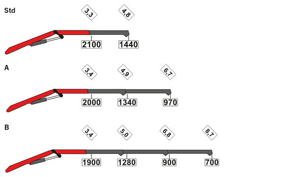 Указанные вылеты касаются угла наклона стрелы 20 ° и поэтому не максимальны. При использовании механических удлинителей стрелы нагрузки, указанные на диаграммах, необходимо снизить на вес этих удлинителей.