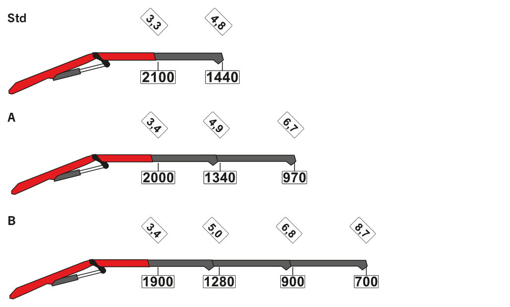Указанные вылеты касаются угла наклона стрелы 20 ° и поэтому не максимальны. При использовании механических удлинителей стрелы нагрузки, указанные на диаграммах, необходимо снизить на вес этих удлинителей.