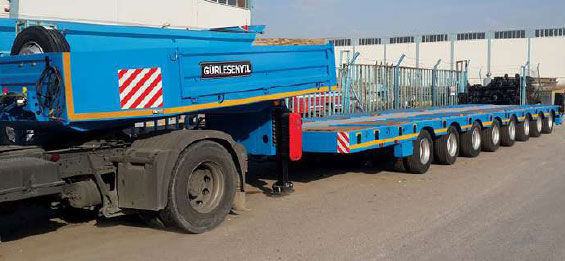 8-осный низкорамный полуприцеп может перевозить грузы от 80 до 120 тонн с длиной полуприцепа от 15 метров до 45 метров. Мы можем использовать турецкую ось или BPW, оси SAF для самостоятельного рулевого управления, гидравлические пульты дистанционного управления, полное гидравлическое управление с гидравлической подвеской для тяжелых грузов.